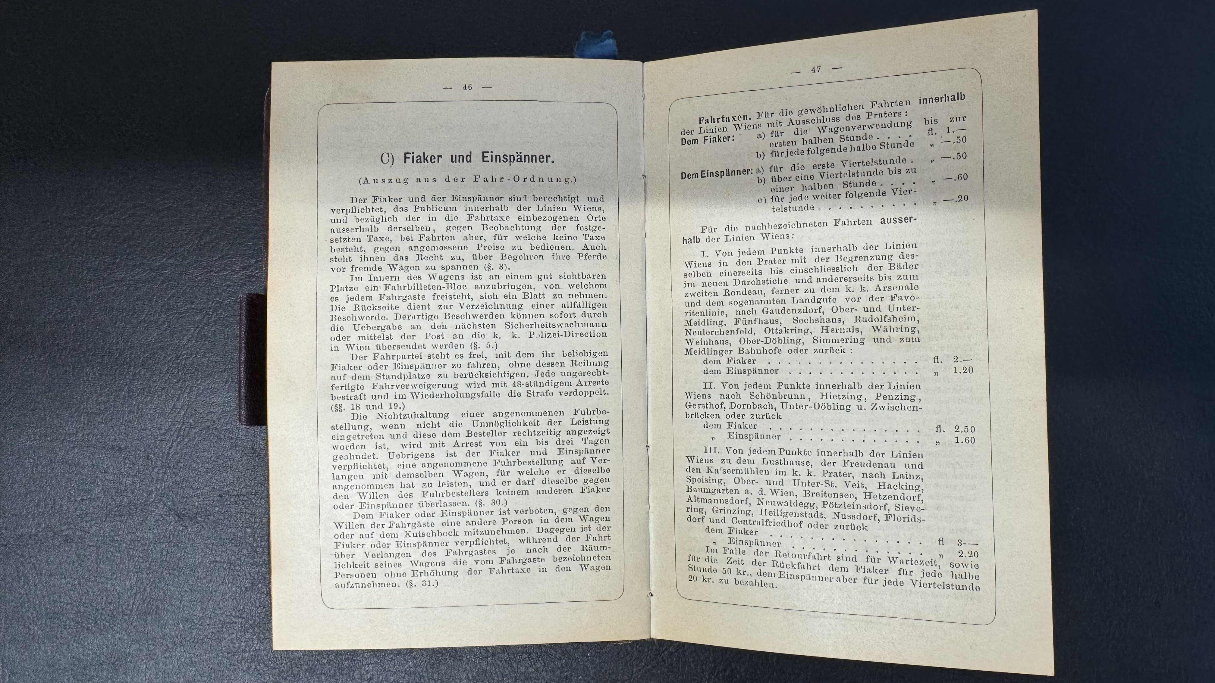 Ganz konkret verdanken wir den Wiener Fiakern das Taxi-Gewerbe, so wie wir es auch heute noch in unserer modernen Welt kennen. Bereits 1693 konnten Kutscher Linzenen erwerben, die sie dazu berechtigten mit ihren Gespannen an dafür vorgesehenen Standplätzen zu parken und um Kundschaft zu werben. Jede Kutsche erhielt zudem ein Kennzeichen. Als äußerst fortschrittlich und neu galt auch die gesetzliche Regelung für Preise und Tarife der jeweiligen Strecken und Fahrten. So wurde bereits Ende des 17. Jahrhunderts die Stadt Wien in unterschiedliche Kernzonen geteilt und die Tarife für die befahrenen Zonen gesetzlich festgesetzt.